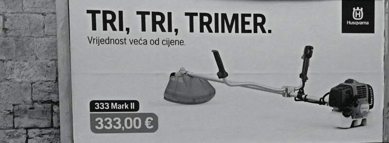 Stavio čovjek oglas u kojem traži: čovjeka za održavanje okućnica. Na whatsapp broju fotografija lovca od 25 godina. Javio sam se, pita me znam li raditi trimerom. Znam, rekoh. Nisam njime radio 15 godina, ali zar može biti komplicirano? Jesu li trimeri napredovali? Imaju li senzore ili dijamantne silkove? Rade li na solarne panele, treba li za njih vozačka dozvola ili neka potvrda? Nije se više javio. Nije me niti pitao pričam li engleski. Čudna neka vremena. Podsjetio me na to ovaj jumbo plakat. Vrijednost veća od cijene.